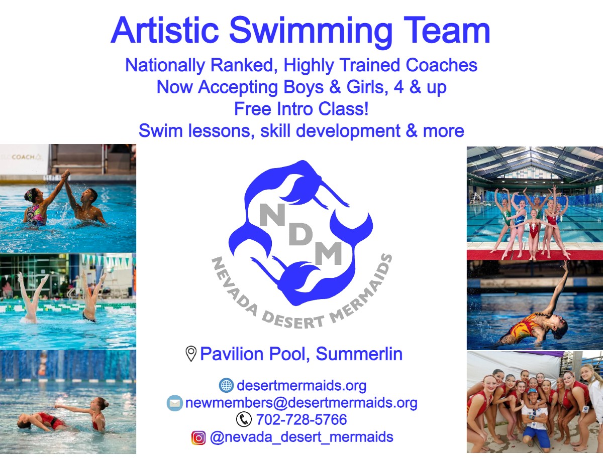 The Desert Mermaids are Nevada's only nationally-ranked competitive artistic swim team offering high-quality professional coaching and technique instruction for all ages and abilities. The goal of our team is to provide every member an opportunity to improve their swimming skills and achieve success at each swimmer's level of ability, from novice to international competitor.